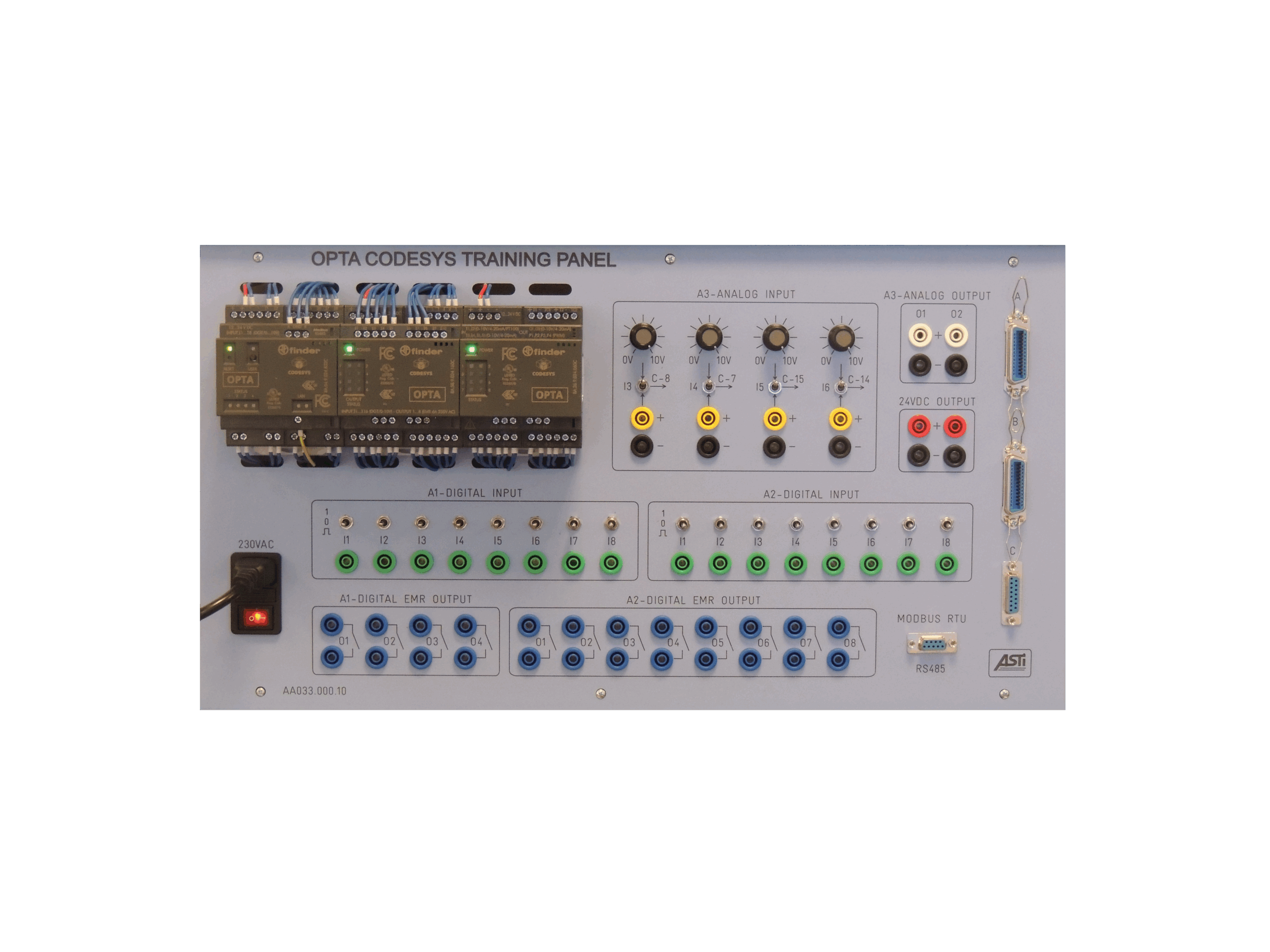 This advanced training panel is designed for industrial automation education, built around Finder OPTA logic relays which are programmed using the industry-standard CODESYS (IEC 61131-3) platform. It provides a powerful and versatile environment for developing complex control and communication skills.