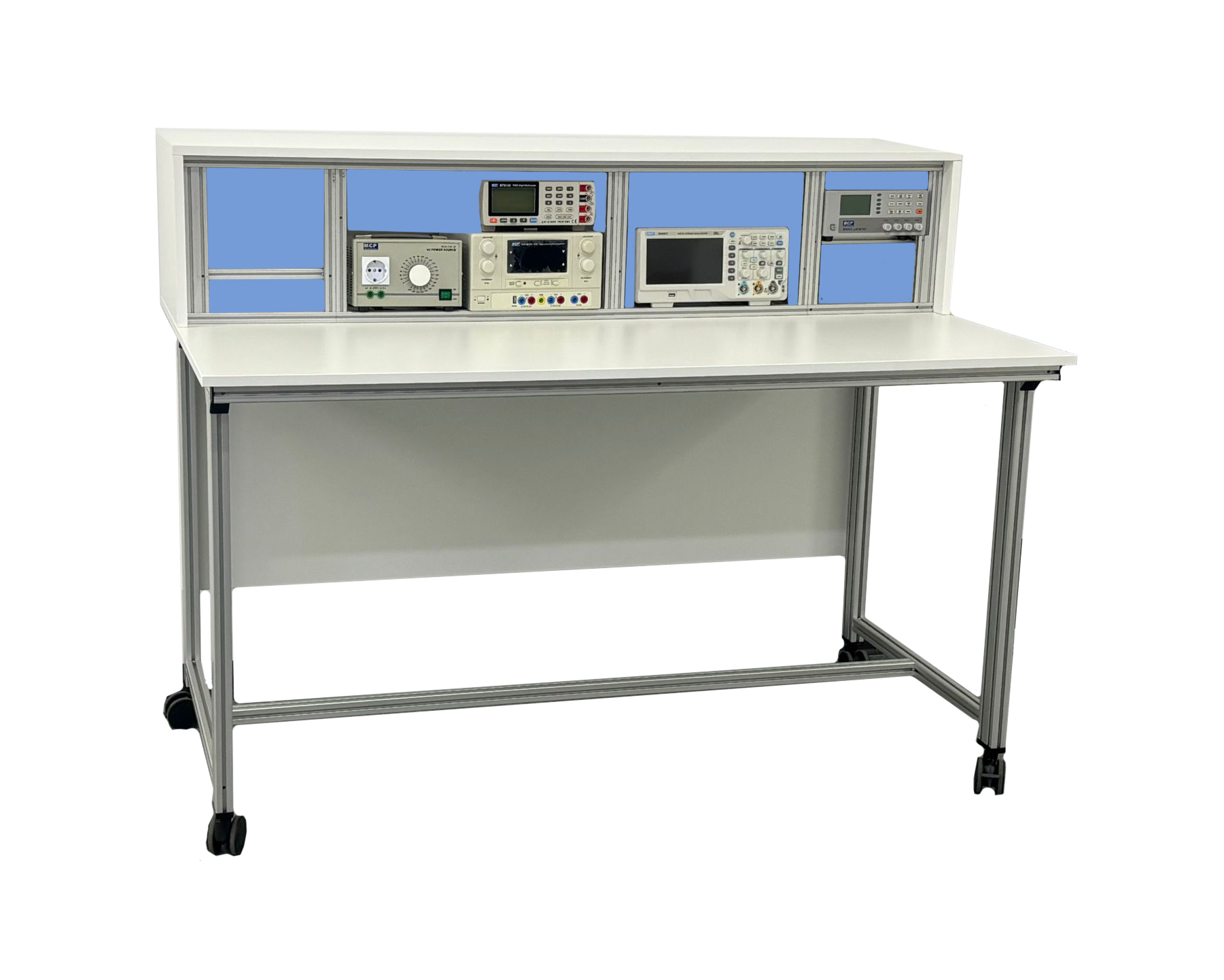 TRAINING WORKBENCH WITH ELECTRONIC INSTRUMENTS is consisting of instrument panel and working table is suitable for students to learn and perform testing of components. Instruments is internally electrically connect and is fitted/on Workbench in the panel such that only front panel and necessary interfaces are easily accessible to use